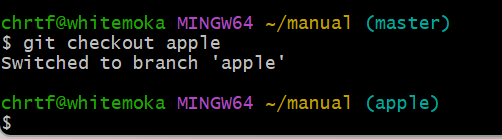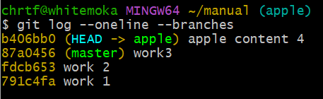 log 명령어를 통해서 master 브랜치에서 apple 브랜치로 분기하기 전까지 작업했던 커밋들은 그대로 apple 브랜치에 복사된 것을 확인할 수 있다.