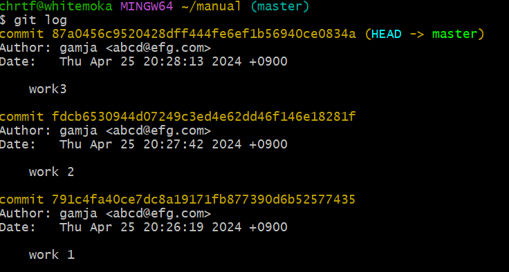 mkdir manual로 파일을 만들어서 cd로 작업 디렉토리를 옮기고, init한다음 수정한 텍스트들을 add로 스테이징, commit으로 스테이지에 있던 파일들의 버전을 생성시키면서 repository에 저장시켰다.