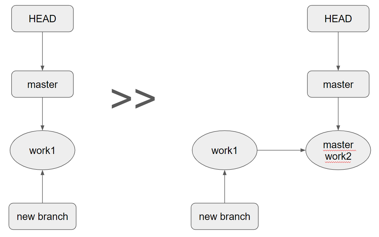 이렇게 하면 위 그림의 경우, new branch의 최신 커밋이 master 브랜치의 최신 커밋 master work2 커밋으로 바뀌었다.