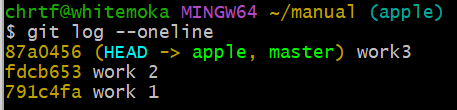 현재 head가 가리키고 있는 브랜치는 apple이고, master의 최신 커밋은 work3이다.