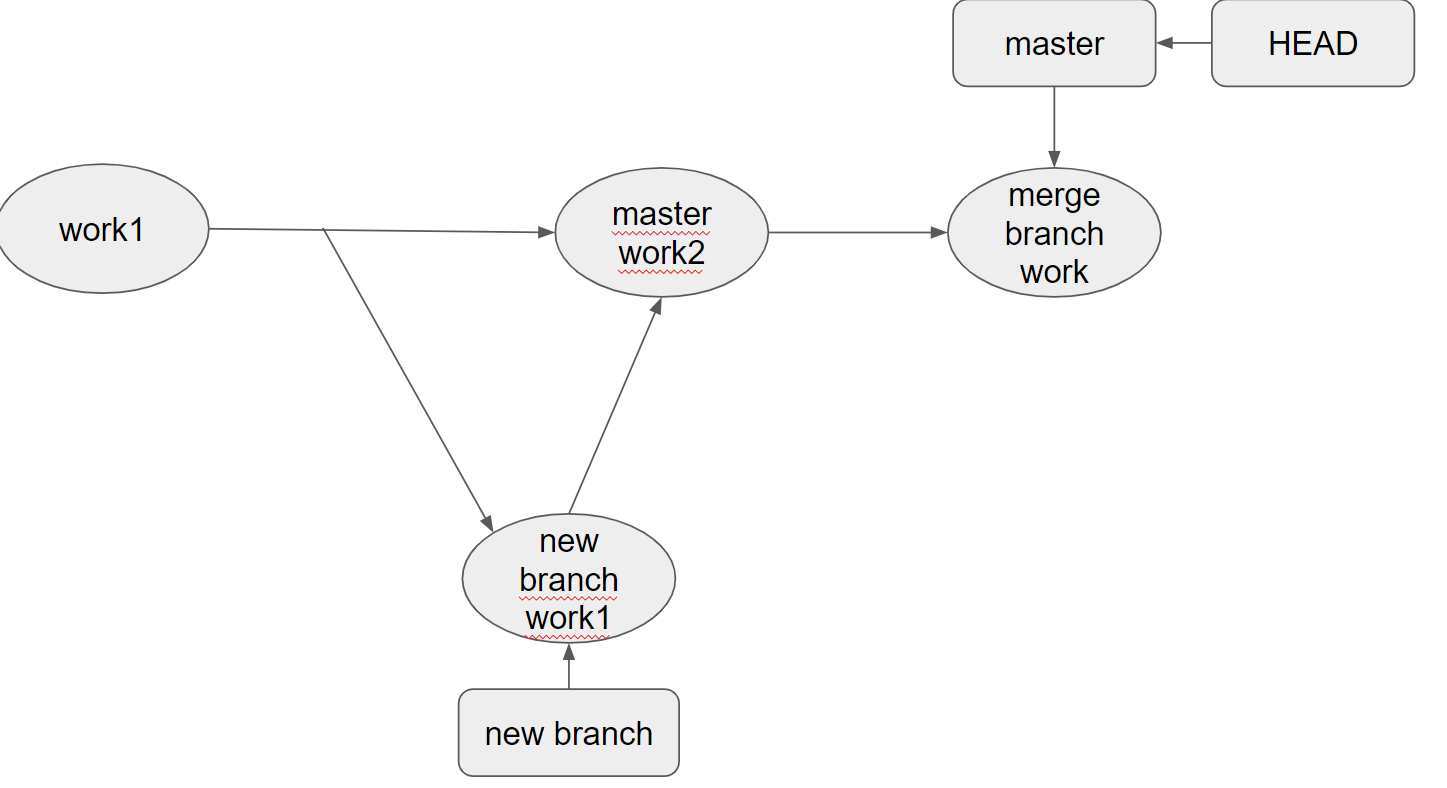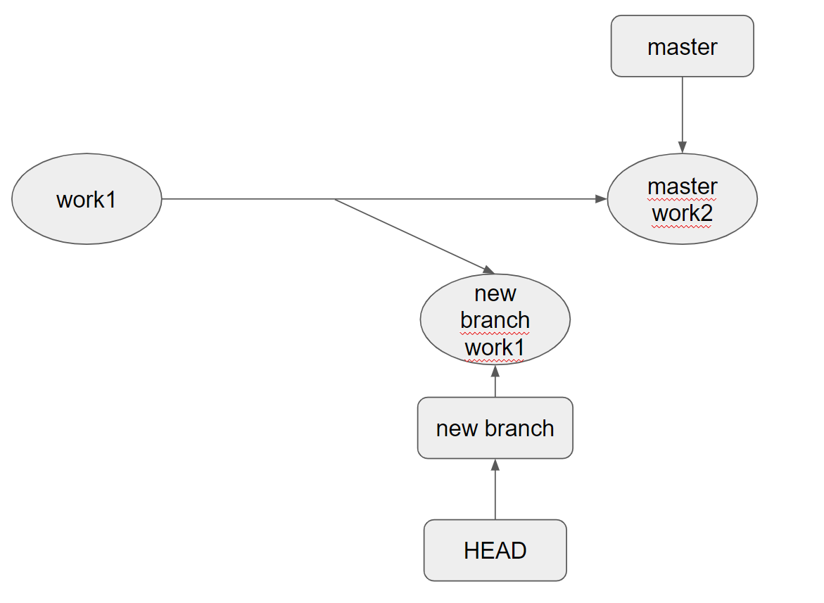 new branch로 checkout한 시점에서 HEAD는 new branch를 가리키고 있고, checkout한 new branch는 new branch work1커밋을 가리키고 있다.