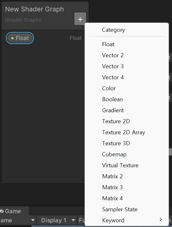 블랙보드의 +버튼을 클릭하여 메테리얼의 인스펙터에서 보여지는 프로퍼티들(인터페이스)를 만들 수 있다.