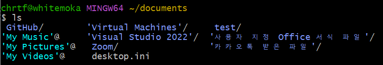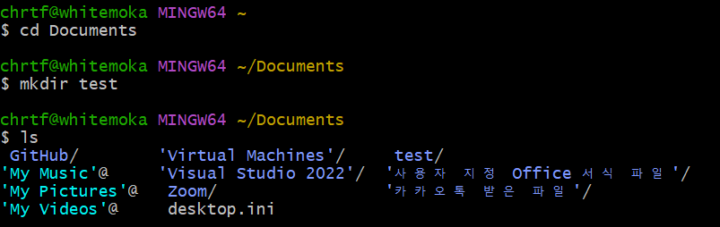실제로 윈도우 파일 탐색기를 통해 Documents 폴더 안에 test 폴더가 생긴 것을 확인했다.