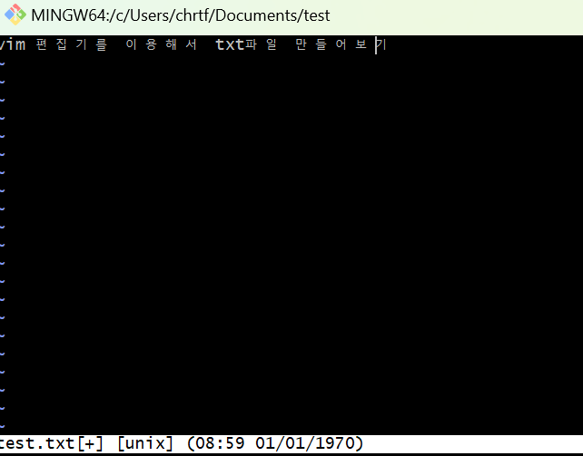다시 test파일을 만들고 디렉토리를 test로 옮긴 다음, 터미널에서 사용할 수 있는 리눅스의 기본 편집기인 vim 편집기를 사용할 것이다.